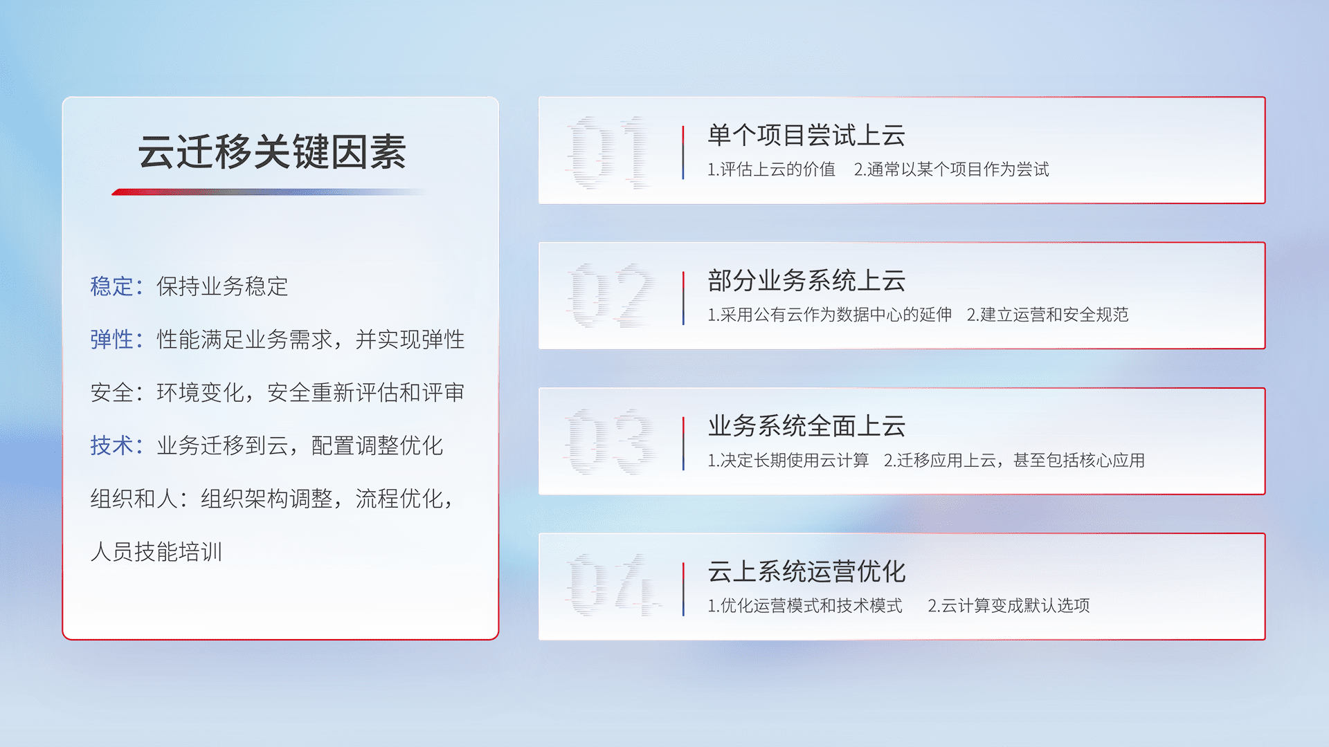 结合实际业务,,,,从规划设计、、云平台选型、、、、云原生改造、、、数据迁移、、、、集成交付,,,,迁移全过程为客户识别最佳上云路径,,做好风险识别管理,,,设计网络架构、、、身份权限、、、安全审计合规、、、、操作审计、、、、日志审计、、、监控告警策略、、、、多站点容灾设计等,,,,对云上基础设施进行整体规划,,提升IT治理水平,,,,以满足弹性、、高可用、、高性能的需求。。。。