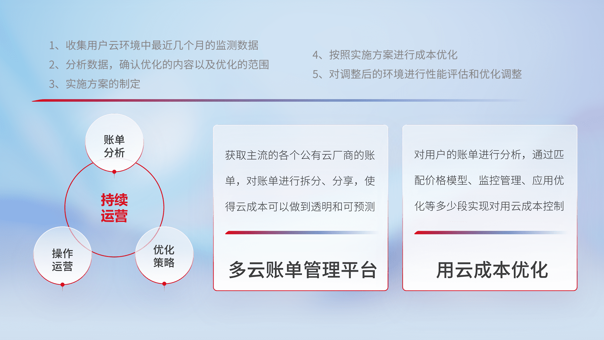 通过多云纳管,,以统一的资源数据模型把客户的云资源进行抽象和封装,,进而实现对多云资源的统一操作,,,保障云资源管理的可靠性、、稳定性与可用性。。。。量身定制化运维内容,,,配置、、、、开发运维、、、、补丁管理、、、、备份、、、监控、、认证和访问管理、、审计和日常巡检等,,保障在用云过程中的可靠度,,稳定度以及高可用率。。。